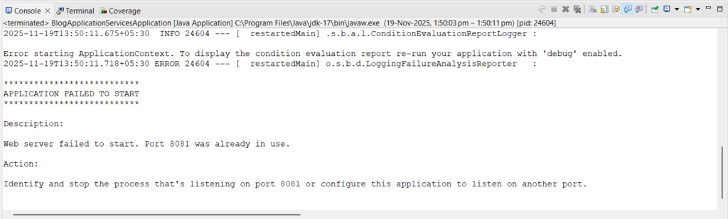 In this article, we’ll explore why this error occurs, how to identify which process is using the port, and how to resolve it. Whether you’re using Windows, macOS, or Linux, the solutions here will help you quickly get your Spring Boot application up and running again.